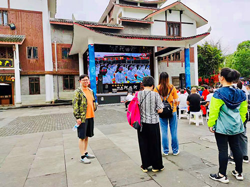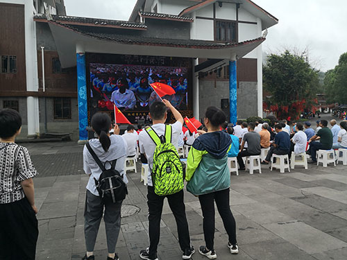 外出活动的党员职工积极加入街头观众队伍,手举国旗收看直播;